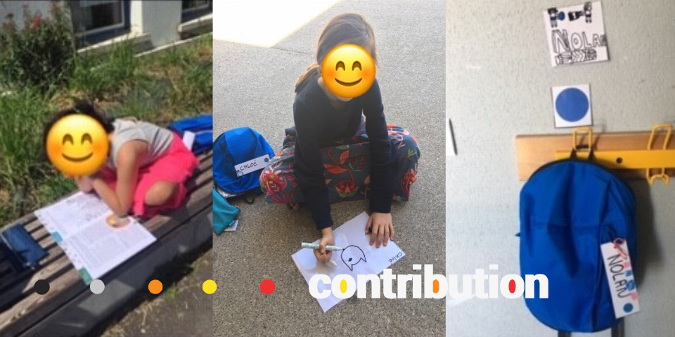Toutes les pièces furent au préalable étiquetées par l’équipe, afin de garantir une utilisation strictement personnelle de chaque objet (y compris les stylos). Les enfants ont ensuite pu inscrire leurs prénoms sur l’étiquette apposée sur le dessus du sac, bien visible, ainsi que sur celle qui correspond au porte-manteaux personnel de chacun.e suivant le groupe auquel ils appartiennent.